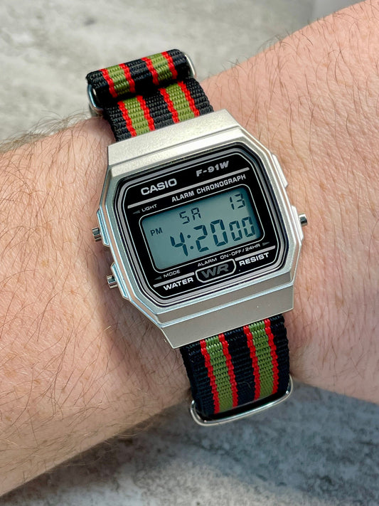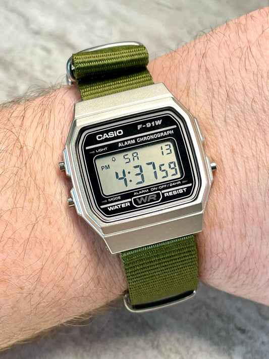 Silver and black Casio Watch on Green Strap