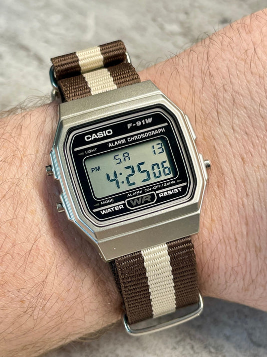 Silver and black Casio Watch on Brown/Creme Strap