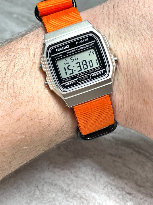 Silver and black Casio Watch on Orange Strap